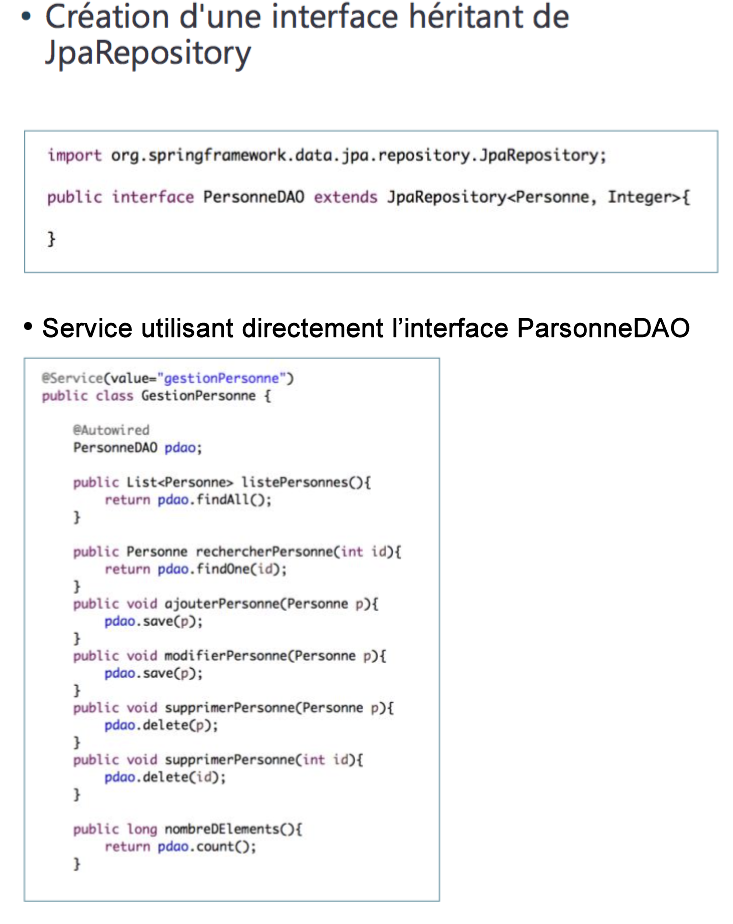 Avec Spring, l’utilisation de JPA sera plus aisée grâce à :
